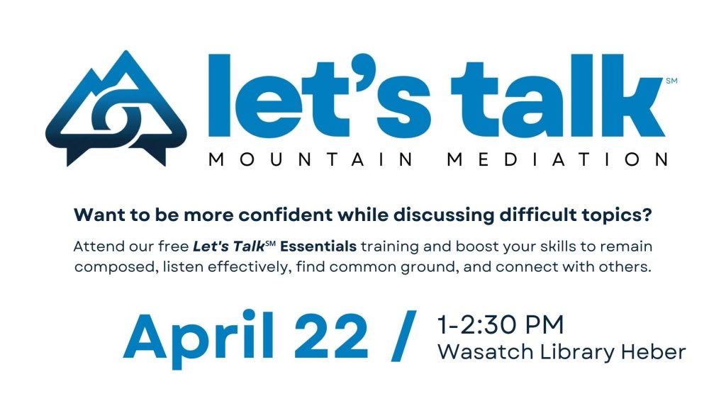 Attend Mountain Mediation’s Let’s Talk℠ Essentials training and boost your skills to remain composed, listen effectively, find common ground, and connect with others.