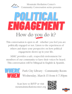 Mountain Mediation Center Inc. is a 501(c)(3) non-profit organization whose mission is to bring people together to prevent conflict, resolve disputes, and improve communication for a more inclusive community.